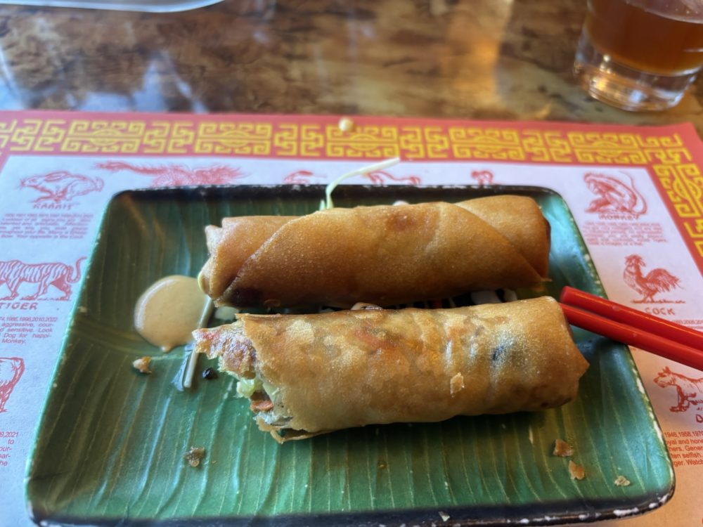 モーテル近くの中華レストランで、春巻き、ラーメンの様なヌードルスープとビールをいただきました。