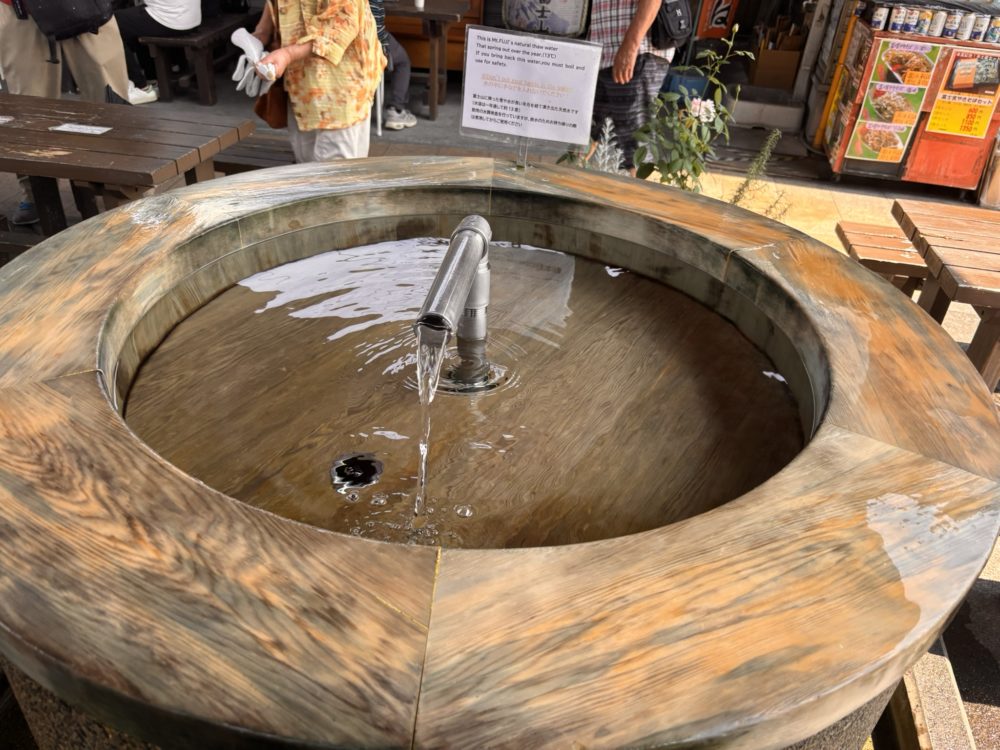 オープンエア―のテーブルは日陰でも若干暑さを感じる日でしたが、飲み水として、富士の天然水が飲めるシステムがあり、冷たい水を美味しくいただく事ができました。