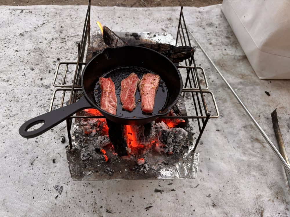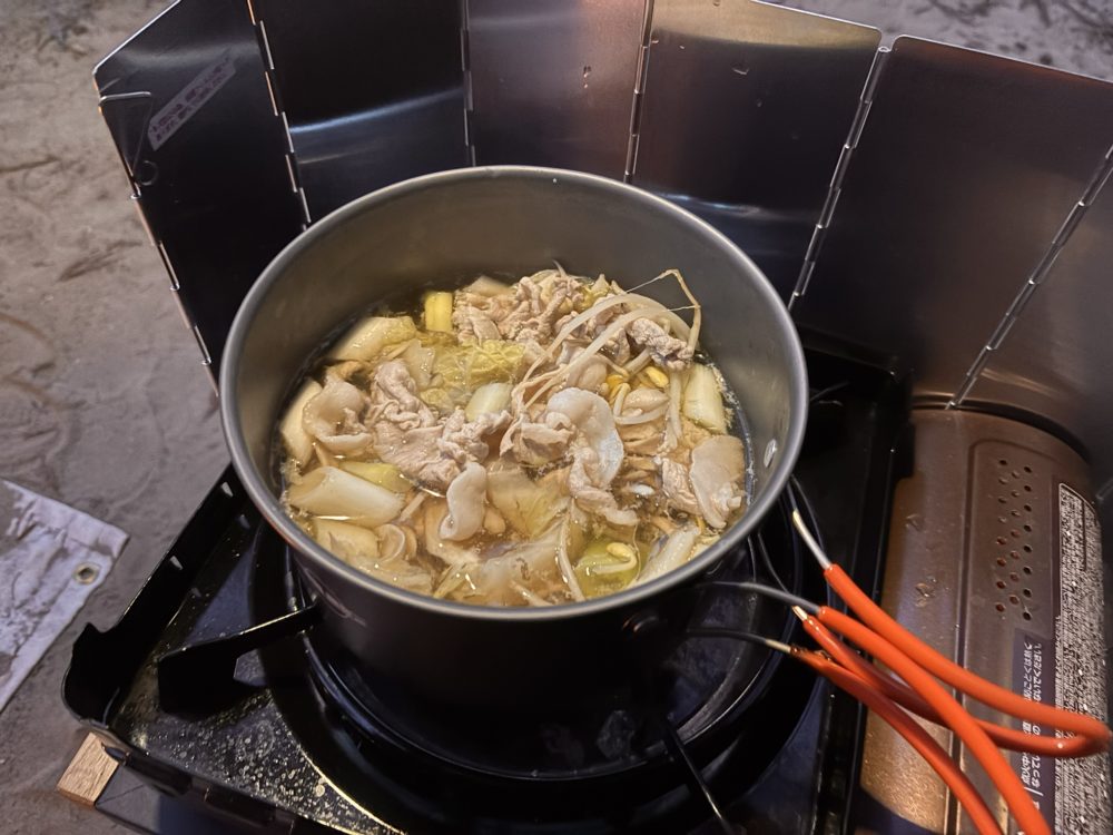 さすがに真冬の平日、ほかのキャンパーはいらっしゃいませんでした。結果、完璧にソロでキャンプを楽しむことができました。夕食は、鳳来牛のしゃぶしゃぶを考えていたのですが、その調達地である「こんたく長篠」の鳳来牛コーナーで、焼き肉用ロースの半額を見つけてしまったため、その焼肉と豚鍋にメニューを変更しました。キャンプの記録です。